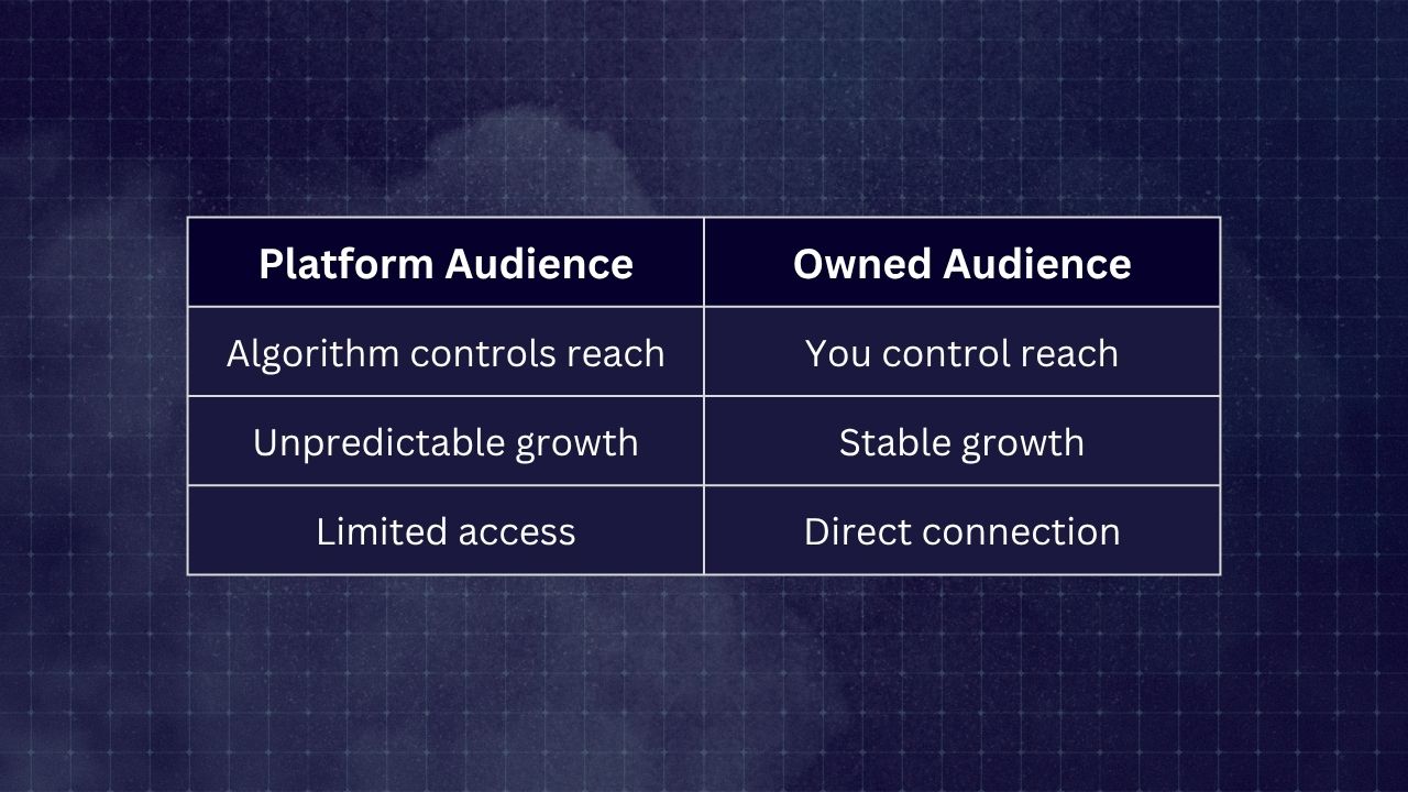 If you rely only on platforms, your growth is always at risk. Algorithms change, reach drops, and you lose access to your audience.